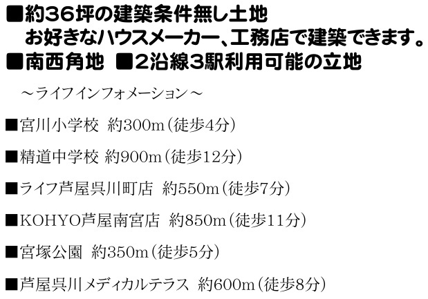 | 交通 | JR東海道線 JR芦屋駅まで 徒歩12分 阪神本線 打出駅まで 徒歩8分 阪神本線 阪神芦屋駅まで 徒歩11分 |