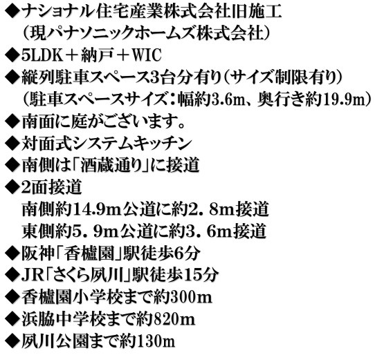 | 交通 | 阪神本線 香櫨園駅まで 徒歩6分 JR東海道線 さくら夙川駅まで 徒歩15分 阪急神戸線 夙川駅まで 徒歩18分 |