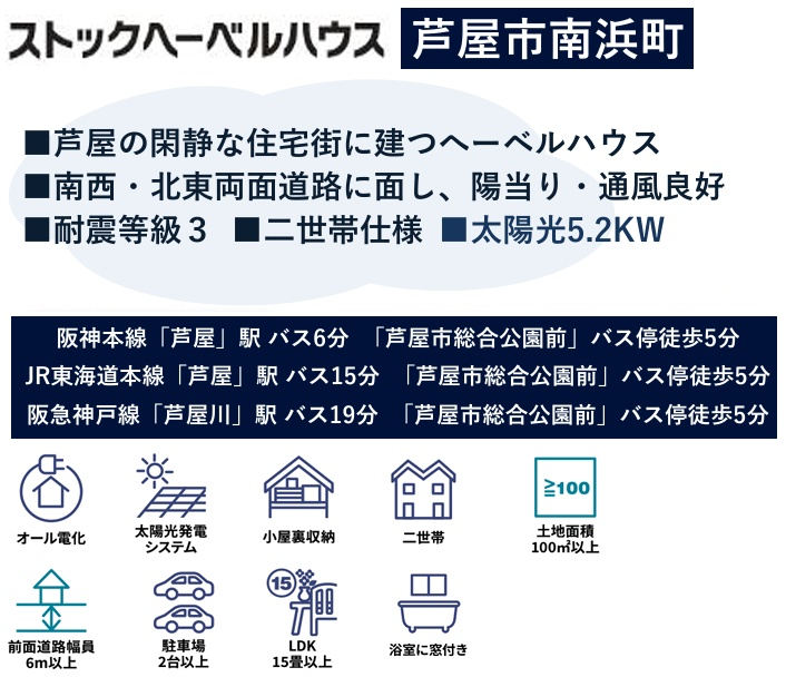 | 交通 | 阪神本線 阪神芦屋駅まで バス6分 停歩5分 JR東海道線 JR芦屋駅まで バス12分 停歩5分 |