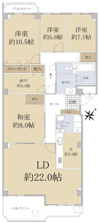 ◆LDKは約27.0帖あり/LDKと和室を合わせて利用可/キッチン横にユーティリティ(家事室)あり/全洋室に窓あり/廊下に納戸約4.4帖あり/南東側と北西側の両面にバルコニーあり/玄関前にトランクルームあり/オートロックあり