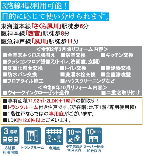 ◆阪神「西宮駅」徒歩3分/JR「さくら夙川駅」徒歩7分/阪急「夙川駅」徒歩13分