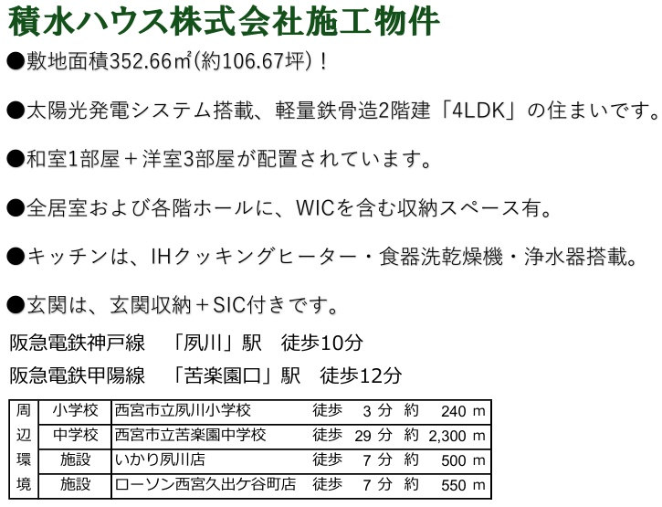 ◆阪急「苦楽園口駅」徒歩18分/阪急「苦楽園口駅」バス6分「苦楽園一番町」バス停徒歩2分/阪急「夙川駅」バス10分「苦楽園一番町」バス停徒歩2分/JR「芦屋駅」徒歩14分「苦楽園一番町」バス停徒歩2分 |