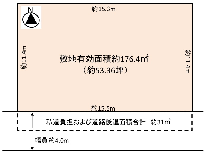 ◆南側公道幅員約4.0mに間口約15.5mが面した整形地です