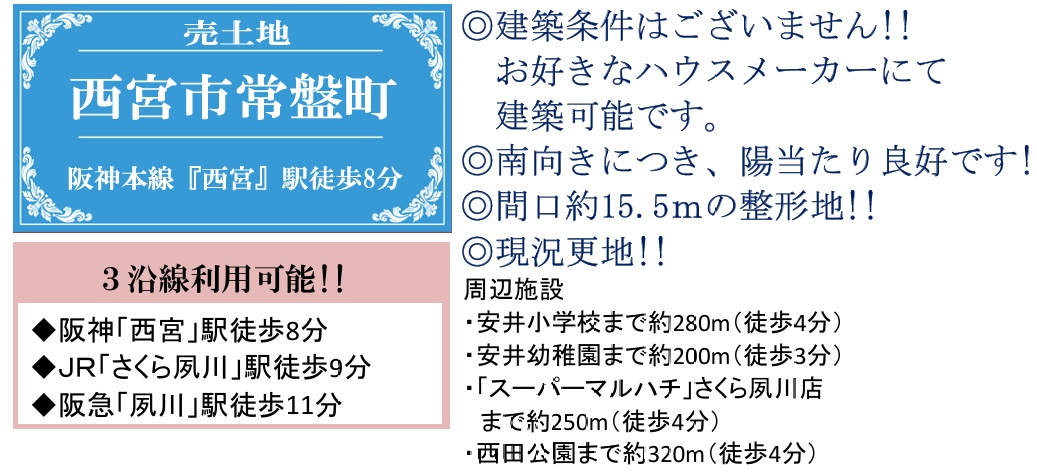 ◆阪神「西宮駅」徒歩8分/JR「さくら夙川駅」徒歩9分/阪急「夙川駅」徒歩11分