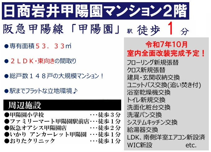 ◆ファミリーマート甲陽園駅前店・徒歩1分/いかりスーパー甲陽園店・徒歩1分/阪急オアシス甲陽園店・徒歩2分/甲陽幼稚園・徒歩1分/甲陽園小学校・徒歩3分/コープ甲陽園・徒歩6分/阪急「甲陽園駅」徒歩1分の駅前立地につき周辺に生活施設が充実しています