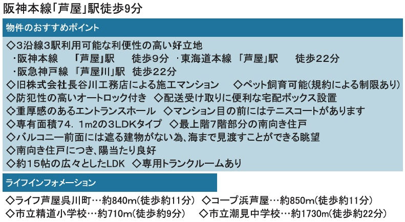 ◆阪神「芦屋駅」徒歩9分/JR「甲南山手駅」徒歩10分/阪急「芦屋川駅」徒歩13分
