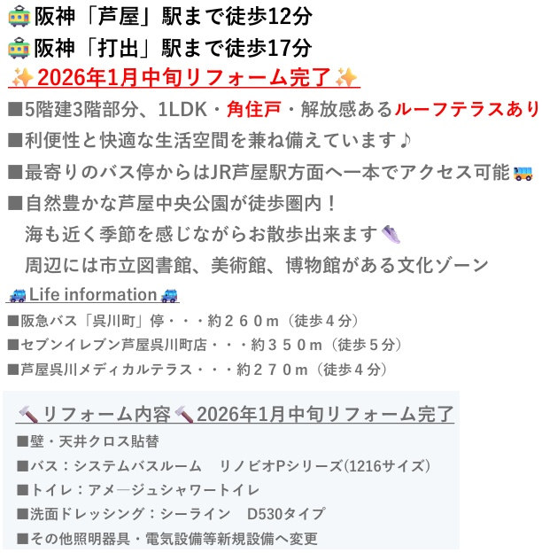 ◆阪神「芦屋駅」徒歩10分/JR「芦屋駅」バス7分「呉川町」バス停徒歩4分