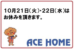 今日はエースホームブログに『エースホームは10月21日(火)・22日(水)の2日間お休みを頂きます。