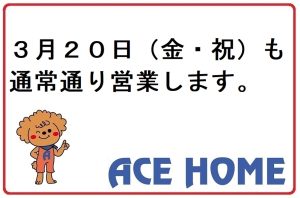 今日はエースホームブログに『エースホームは3月20日(金・祝)も通常通り営業します。』を書きました!