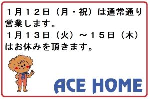 今日はエースホームブログに『1月12日(月・祝)は通常通り営業します。 13日(火)~15日(木)はお休みを頂きます。』を書きました!