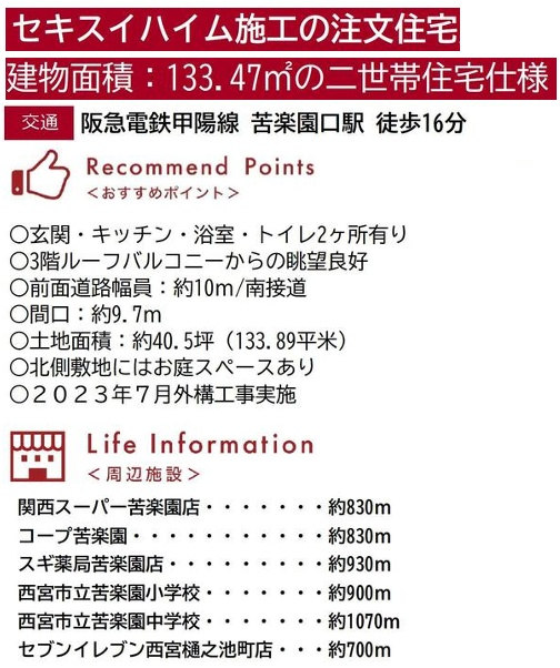 | 交通 | 阪急甲陽線 苦楽園口駅まで 徒歩16分 | 学区 | 苦楽園小学校 900m 苦楽園中学校 1,100m |