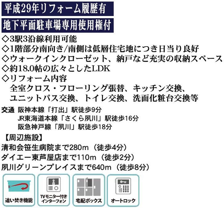 阪神本線 打出駅まで 徒歩8分 JR東海道線 さくら夙川駅まで 徒歩13分 |