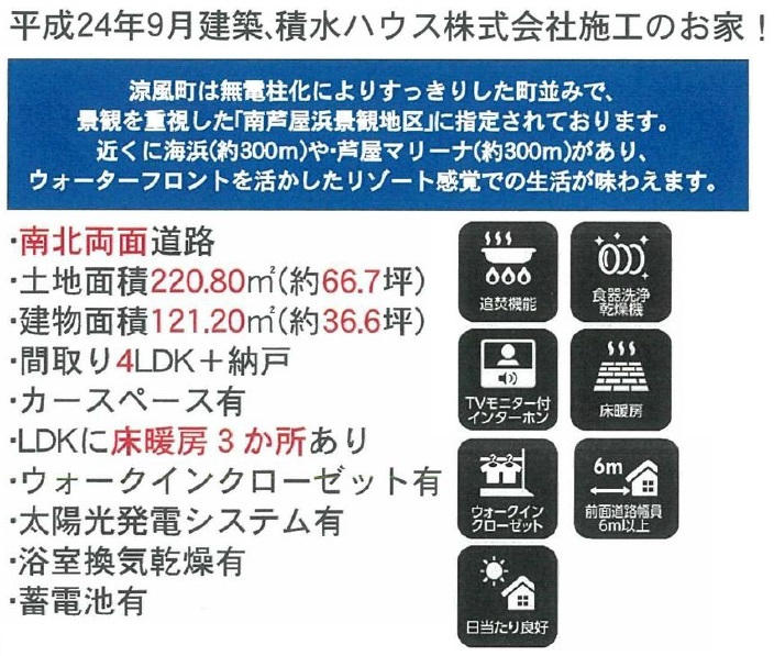 | 特色 | 南向き(南東向きと南西向きを含む)、陽当たり良好、駐車場2台分以上、大手ハウスメーカー施工、太陽光発電付 | ||