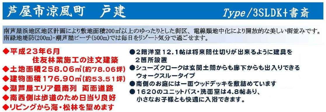 ◆2011年(平成23年)6月住友林業施工の注文建築です ◆土地面積約78.06坪/建物面積約53.51坪 ◆潮芦屋エリア最南列に位置します/3SLDK+書斎の間取りです/リビングから海・松林を望めます/LDKは約22.5帖あり/南側のお庭は一面ウッドデッキ敷きです/2階洋室12.1帖は将来間仕切りが出来るように建具を2ヶ所設置/シューズクロークは玄関土間からも廊下からも出入り出来るウォークスルータイプ/お風呂は1620サイズ/洗面室は約4.8帖あり小さなお子様とも快適に入浴出来ます ◆駐車場は3台分あり ◆JR「芦屋駅」と阪神「芦屋駅」へバス便あり/バス停徒歩4分 ◆ライフガーデン潮芦屋(スーパーマルハチ・ケーヨーデーツー・ウエルシア・サイゼリア等あり)・徒歩11分/セブンイレブン(24時間営業)・徒歩12分/スパ水春・徒歩11分 |