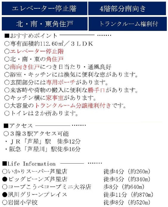 ◆専有面積112.60㎡の3LDKです ◆キッチン横に家事室(スロップシンク付)と勝手口あり/キッチンと浴室に窓あり/全居室に窓と収納あり/トイレに手洗いカウンターあり/玄関前にアルコーブと門扉あり/トランクルームあり(管理費600円/月)/エレベーター停止階です ◆分譲駐車場権利付(管理費1,940円+積立金5,350円+保守費1,500円=合計8,790円/月) ◆JR「芦屋駅」徒歩10分/阪神「打出駅」徒歩12分/阪急「芦屋川駅」徒歩17分 ◆いかりスーパー芦屋店・徒歩3分/ビックビーンズ芦屋店・徒歩3分/岩園公園・徒歩3分/東山郵便局・徒歩4分/コープミニ大谷・徒歩5分/セブンイレブン芦屋東山町店・徒歩5分/仲ノ池・徒歩5分 |