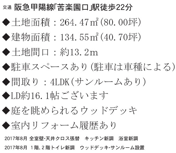 ◆土地面積約80.00坪あり ◆建物面積約40.70坪の4LDKです/LDKは約16.1帖あり/ウッドデッキあり/リフォーム履歴あり ◆道路間口約13.2mあり ◆駐車場あり ◆建替え用の土地としてもご検討ください ◆阪急「夙川駅」・「苦楽園口駅」とJR「芦屋駅」へバス便あり ◆緑豊な閑静住宅街です |
