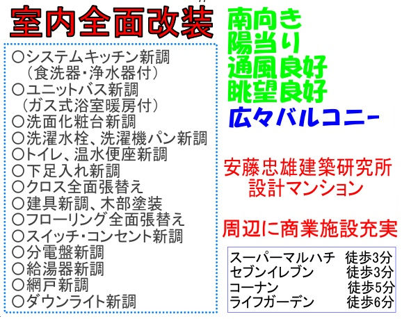 ◆1999年(平成11年)1月築で安藤忠雄設計のデザイナーズマンションです ◆専有面積71.44㎡の3LDKです ◆LDKは約15.1帖あり/全洋室に窓と収納あり/フルフラット設計です ◆2026年2月初旬にリフォーム完成渡し ◆敷地内駐車場・空き有り(10,000円~11,000円/月) ◆阪神「芦屋駅」へバス8分「潮芦屋中央」バス停まで徒歩1分/阪神「芦屋駅」とJR「芦屋駅」と阪急「芦屋川駅」へバス便あり ◆ライフガーデン潮芦屋(スーパーマルハチやコーナン等あり)徒歩2分/セブンイレブン潮芦屋店・徒歩1分/陽光北公園・徒歩3分/親水中央公園・徒歩6分/芦屋総合公園・徒歩10分 |