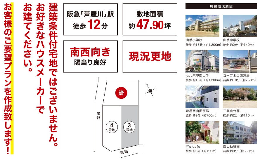 ◆芦屋市内と大阪湾一望の眺望あり♪ ◆公道幅員約4.8mに間口約8.1mが面した整形地です ◆更地につき即建築可 ◆建築条件なし/お好きなハウスメーカーや工務店で建築可 ◆阪急「芦屋川駅」徒歩12分/JR「甲南山手駅」徒歩12分 ◆三条公園・徒歩1分/山手サンモール・徒歩9分/コープミニ西芦屋・徒歩10分/セルバ甲南山手(関西スーパー等あり)・徒歩14分 |