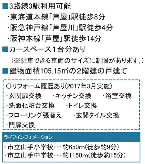 ◆公道幅員約4.6mに間口約2.1mが面した区画です ◆2017年3月のリフォーム履歴あり:システムキッチン交換/ユニットバス交換/洗面化粧台交換/トイレ交換(温水洗浄便座付)/フローリング張替/門扉交換/玄関タイル交換/等 ◆駐車場は幅制限あり ◆閑静な住宅街です ◆JR「芦屋駅」徒歩8分/阪急「芦屋川駅」徒歩4分/阪神「芦屋駅」徒歩14分 ◆東芦屋緑地・徒歩3分/業平さくら通り・徒歩3分/山手サンモール・徒歩4分/ローソン芦屋川駅前店・徒歩5分/JR芦屋駅周辺にお買い物施設・飲食店・銀行などがあり便利です ◆芦屋市松ノ内町10-4 |