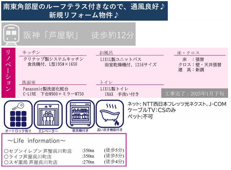 ◆専有面積44.08㎡の1LDKです ◆LDKは約11.3帖あり/L字型の対面キッチン/南側にバルコニーと東にルーフテラス17.01㎡付 ◆2026年2月リノベーション済:システムキッチン交換(食洗機付)/ユニットバス交換(暖房乾燥機付)/洗面化粧台交換/トイレ交換(温水洗浄便座付)/建具交換/フローリング張替/クロス張替/CF張替/ハウスクリーニング/等 ◆マンション敷地の南北両方から出入りできます/オートロックあり ◆阪神芦屋駅・徒歩11分/JR「芦屋駅」徒歩17分/JR「芦屋駅」バス6分「呉川町」バス停歩4分 ◆ライフ芦屋呉川町店・徒歩4分/芦屋市立図書館・徒歩4分/コープ浜芦屋・徒歩5分/セブンイレブン芦屋呉川町店・徒歩5分/呉川公園・徒歩6分 |