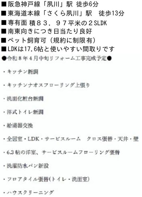 ◆専有面積83.97㎡の3LDKです/5階のお部屋で眺望あり♪ ◆LDKは約17.6帖あり/LDKは南面と東面の2面採光で明るいです/全居室に窓と収納あり/トイレは手洗いカウンター付 ◆2026年(平成30年)7月室内全面リフォーム済:システムキッチン交換/洗面化粧台交換/トイレ交換(温水洗浄便座付)/選択防水パン交換/給湯器交換/フローリング張替/クロス貼替/CF張替/ハウスクリーニング/等 ◆1住戸に1台の駐車スペース有り(12,000円~20,000円/月) ◆ペット飼育可(規約あり) ◆阪急「夙川駅」徒歩6分/JR「さくら夙川駅」徒歩13分/阪神「香櫨園駅」徒歩15分 ◆セブンイレブン阪急夙川駅南口店・徒歩3分/夙川グリーンタウン(ダイエー夙川店などあり)・徒歩4分/夙川グリーンプレイス・徒歩6分/夙川公園・徒歩7分 |