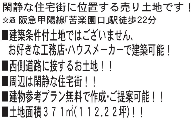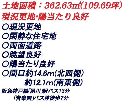 ◆阪急「苦楽園口駅」徒歩18分/阪急「夙川駅」バス10分「苦楽園一番町」バス停まで徒歩4分/JR「芦屋駅」バス13分「苦楽園一番町」バス停まで徒歩4分