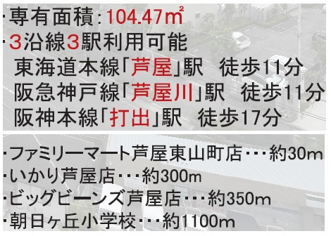 | 交通 | JR東海道線 JR芦屋駅まで 徒歩9分 阪急神戸線 芦屋川駅まで 徒歩10分 阪神本線 打出駅まで 徒歩17分 |