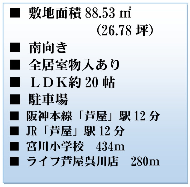 | 交通 | JR東海道線 JR芦屋駅まで 徒歩13分 阪神本線 阪神芦屋駅まで バス12分 停歩15分 阪神本線 打出駅まで バス12分 停歩3分 |