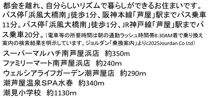 ◆阪神「芦屋駅」へバス8分「潮芦屋中央」バス停まで徒歩1分/阪神「芦屋駅」とJR「芦屋駅」と阪急「芦屋川駅」へバス便あり