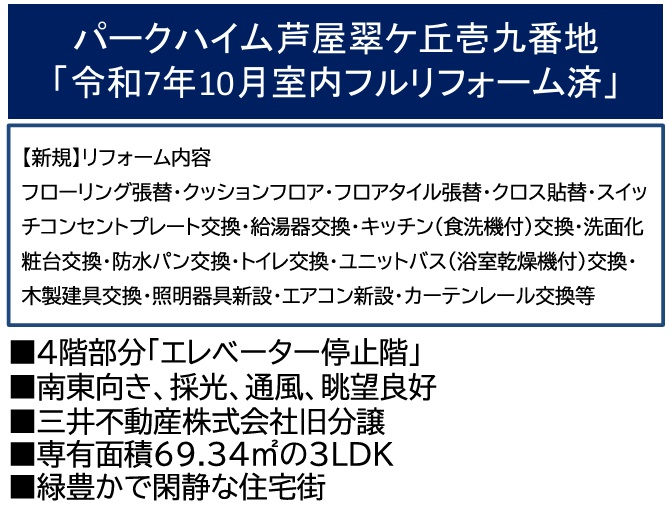 ◆2025年10月室内全面リフォーム済:システムキッチン交換(食洗機付)/ユニットバス交換(暖房乾燥機付)/洗面化粧台交換/給湯器交換/洗濯機用防水パン交換/トイレ交換(温水洗浄便座付)/フローリング張替/クロス張替/CF張替/照明器具設置/エアコン設置/ハウスクリーニング/等