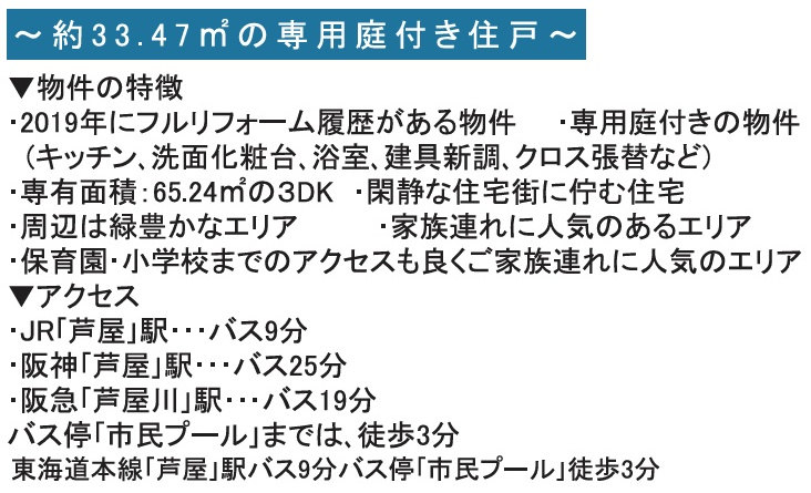 | 交通 | JR東海道線 JR芦屋駅まで バス8分 停歩3分 阪急神戸線 芦屋川駅まで バス11分 停歩3分 |