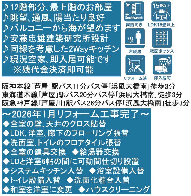 ◆2026年1月室内リフォーム済:システムキッチン交換/ユニットバス交換/洗面化粧台交換/給湯器交換/トイレ交換(温水洗浄便座付)/フロアタイル張替/クロス張替/CF張替/建具交換/和室→洋室に変更/ハウスクリーニング/等