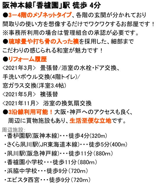 | 交通 | 阪神本線 香櫨園駅まで 徒歩4分 JR東海道線 さくら夙川駅まで 徒歩6分 阪急神戸線 夙川駅まで 徒歩10分 |