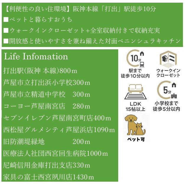 ◆コープ浜芦屋・徒歩3分/セブンイレブン芦屋呉川町店・徒歩4分/打出浜公園・徒歩4分/KOHYO(コーヨー)芦屋南宮店・徒歩6分/宮川小学校・徒歩6分/精道中学校・徒歩9分 |
