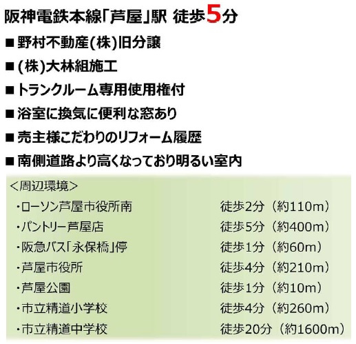 | 交通 | 阪神本線 阪神芦屋駅まで 徒歩5分 JR東海道線 JR芦屋駅まで 徒歩18分 阪急神戸線 芦屋川駅まで 徒歩20分 |