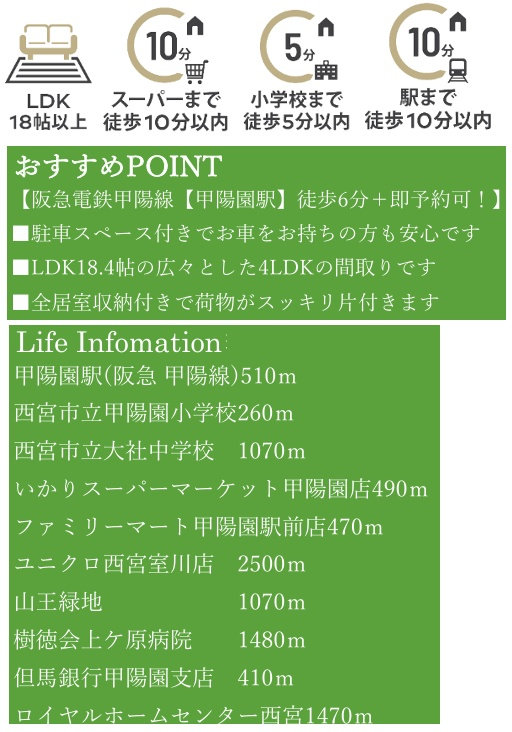 | 交通 | 阪急甲陽線 甲陽園駅まで 徒歩6分 | 学校区 | 小学校区:甲陽園小学校 240m 中学校区:大社中学校 950m |