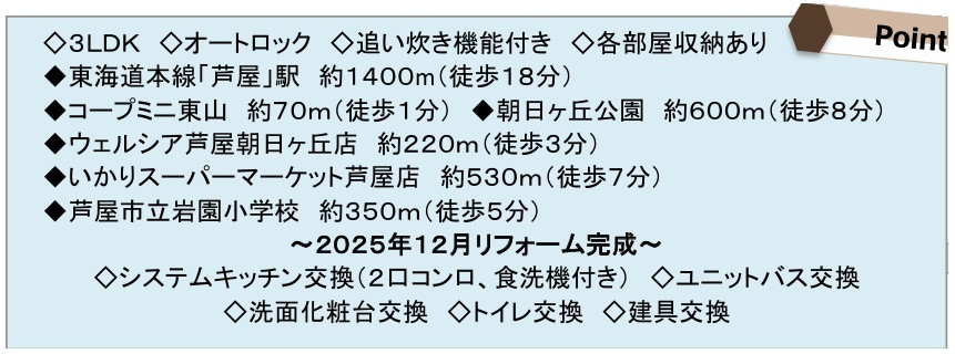 ◆コープミニ東山・徒歩1分/東山北公園・徒歩2分/ウエルシア芦屋朝日ケ丘店・徒歩3分/いかりスーパー芦屋店・徒歩6分
