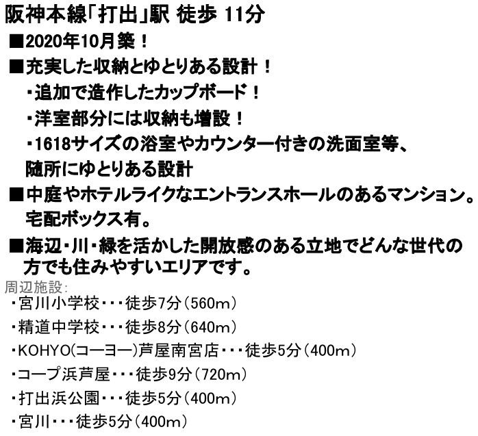 ◆芦屋南宮郵便局・徒歩3分/打出浜公園・徒歩4分/コーヨー(KOHYO)芦屋南宮店・徒歩5分/セブンイレブン芦屋南宮町店・徒歩5分/宮川幼稚園・徒歩5分/宮川小学校・徒歩6分/コープ浜芦屋・徒歩8分