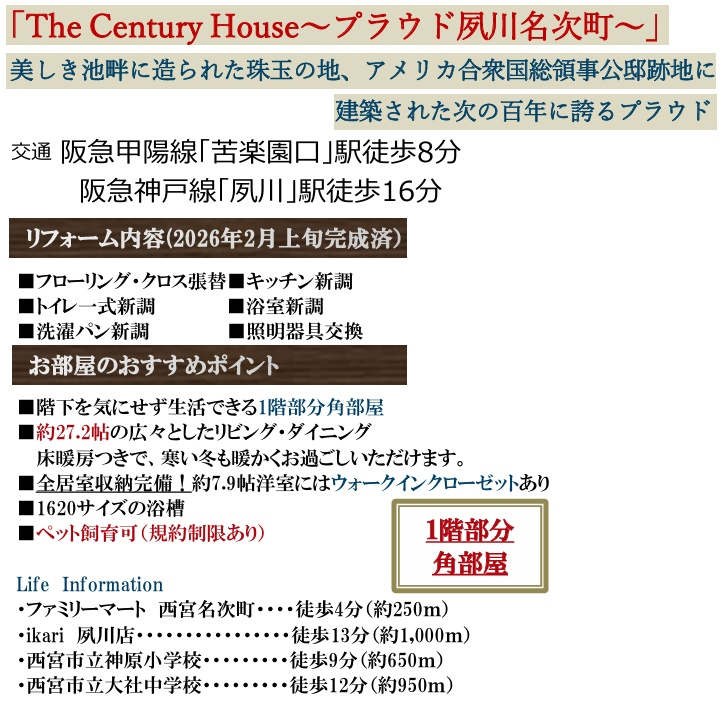 ◆ニテコ池・徒歩1分/ファミリーマート西宮名次町店・徒歩4分/ウエルシア西宮北名次店・徒歩5分/西宮震災記念碑公園・徒歩5分/夙川公園・徒歩7分/いかりスーパー夙川店・徒歩13分 |