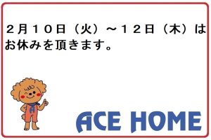今日がエースホームの最終営業日で、明日から1月5日(木)まで冬季休暇を頂きます。