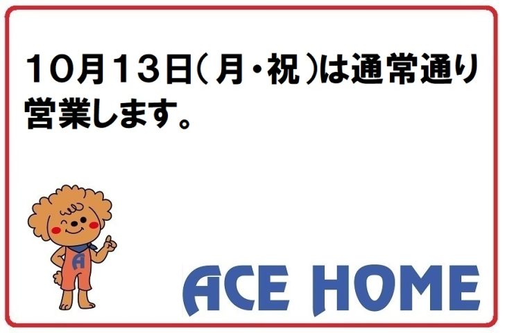 エースホームは10月13日(月・祝)も通常通り営業します。