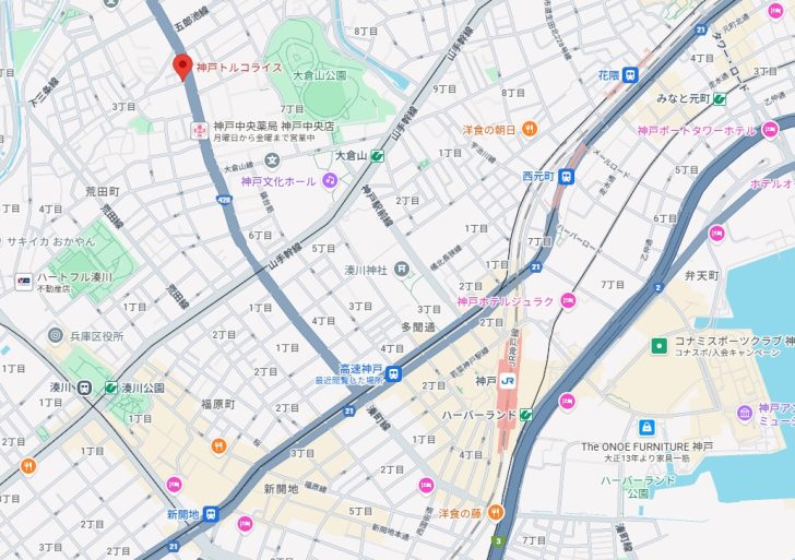 ワタクシは阪神電車の高速神戸駅(JR神戸駅近く)から北へ約1㎞(約16分)歩いて行きました。