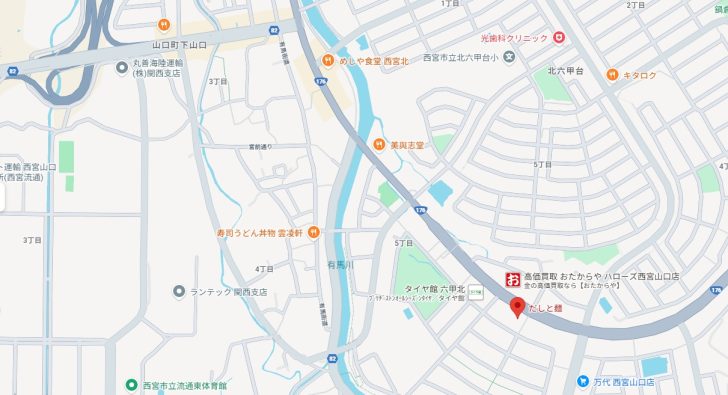 国道176号線沿いの南側、「ハローズ西宮山口モール」「旧・コープ西宮北店」の南側にあります。