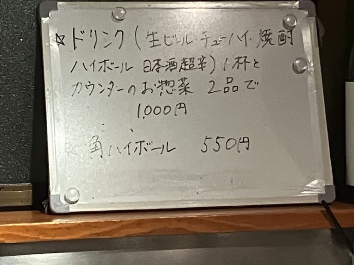 ↑ドリンクとカウンターのお惣菜(おばんざい)2品で1000円を注文。