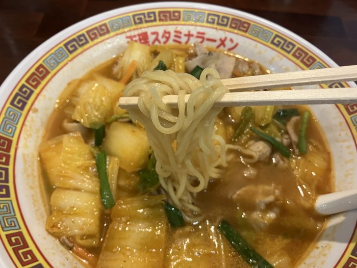 天理スタミナラーメンは、白菜がたっぷり入りニンニクと唐辛子が効いた醤油味のラーメンです。