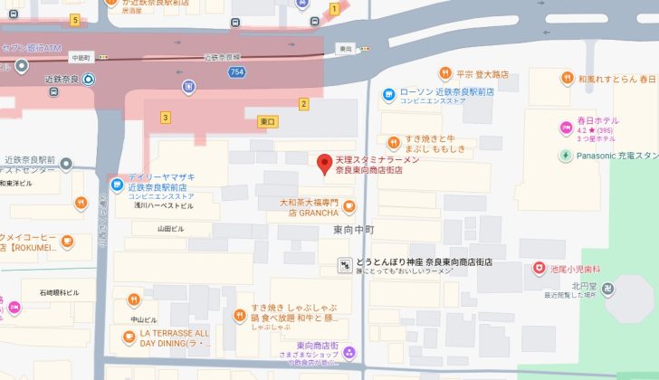 近鉄「奈良駅」から南東へ徒歩5分くらいの「奈良東向商店街」内にあります。