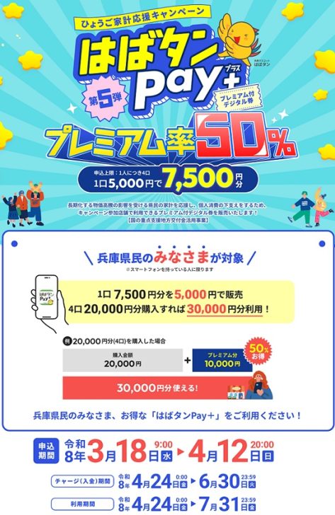 ひょうご家計応援キャンペーン「はばたんPay+(ペイプラス)」が3月18日から申し込み開始となります♪