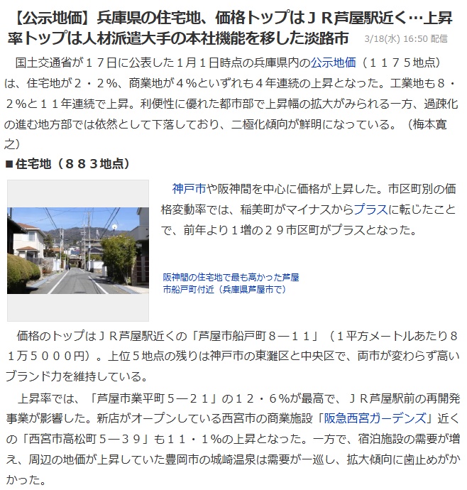 兵庫県内で芦屋市船戸町が公示地価の価格トップとなりました。